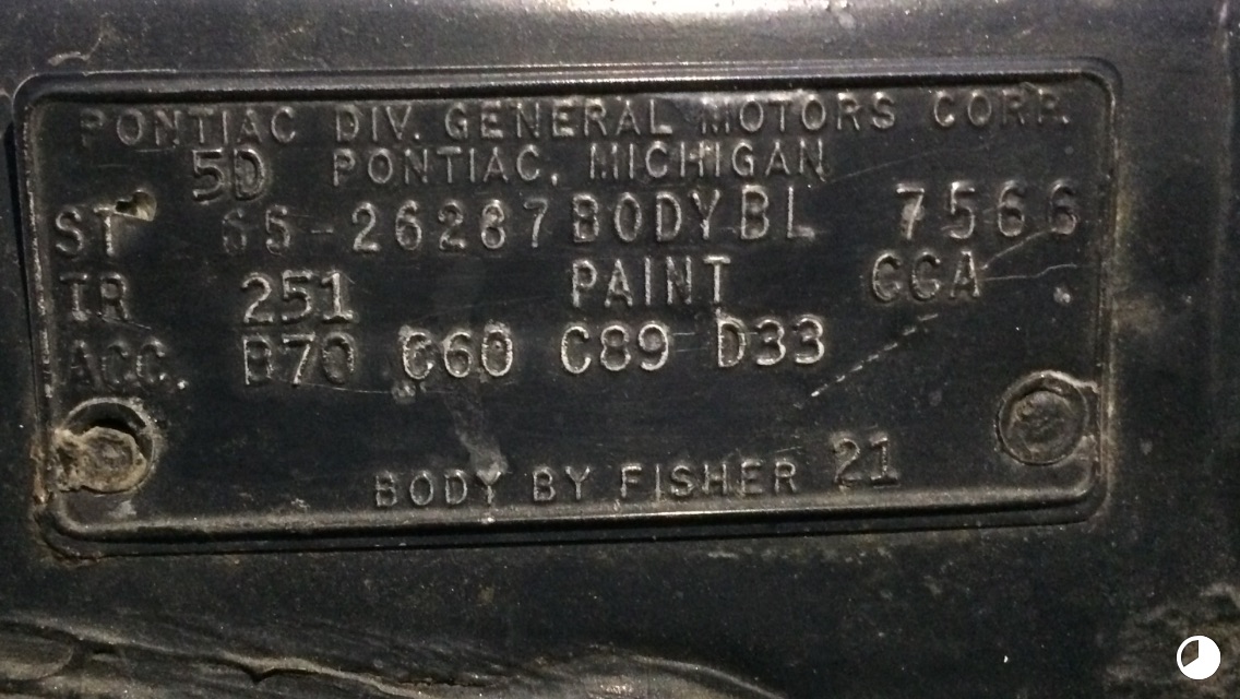 2Ser ut att vara en helvit 1965 Bonneville SportsCoupe´ med svart stripe och blå vinylinredning, den 7566:e bilen byggd i Linden, New Jersey, fjärde veckan i maj 1965.