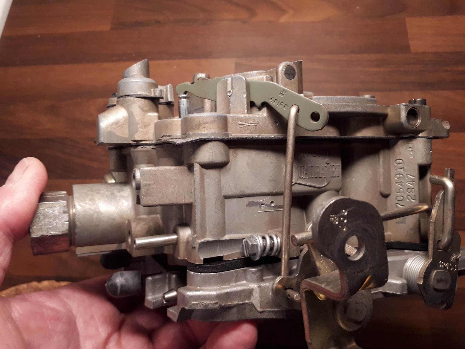 En ny (provkörd) Service Replacement Rochester Quadrajet 17054910 ämnad för 1973 Pontiac 455 SuperDuty, passar även 1974 455 SD och andra High Performance Pontiac V8.
