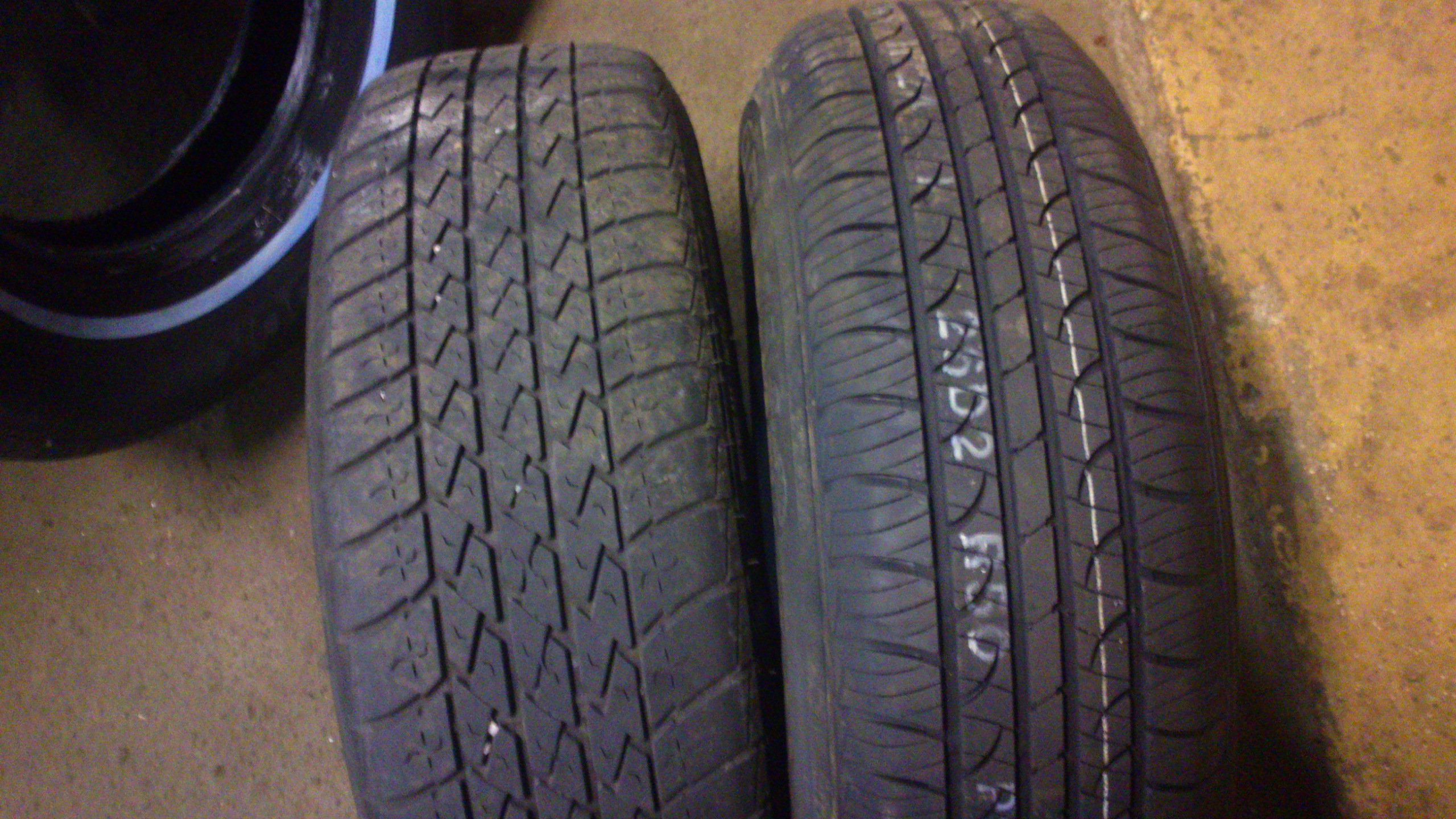 Jag har till slut köpt hankook 215/75-14,bilen uppför sig normalt nu igen men de blev lite höga fram,(gillar lågt). på bilden syns mina gamla enterprise 205/75-14 till vänster som är bredare än de nya 215/75-14. Men helt ok däck för 1250 kr st
