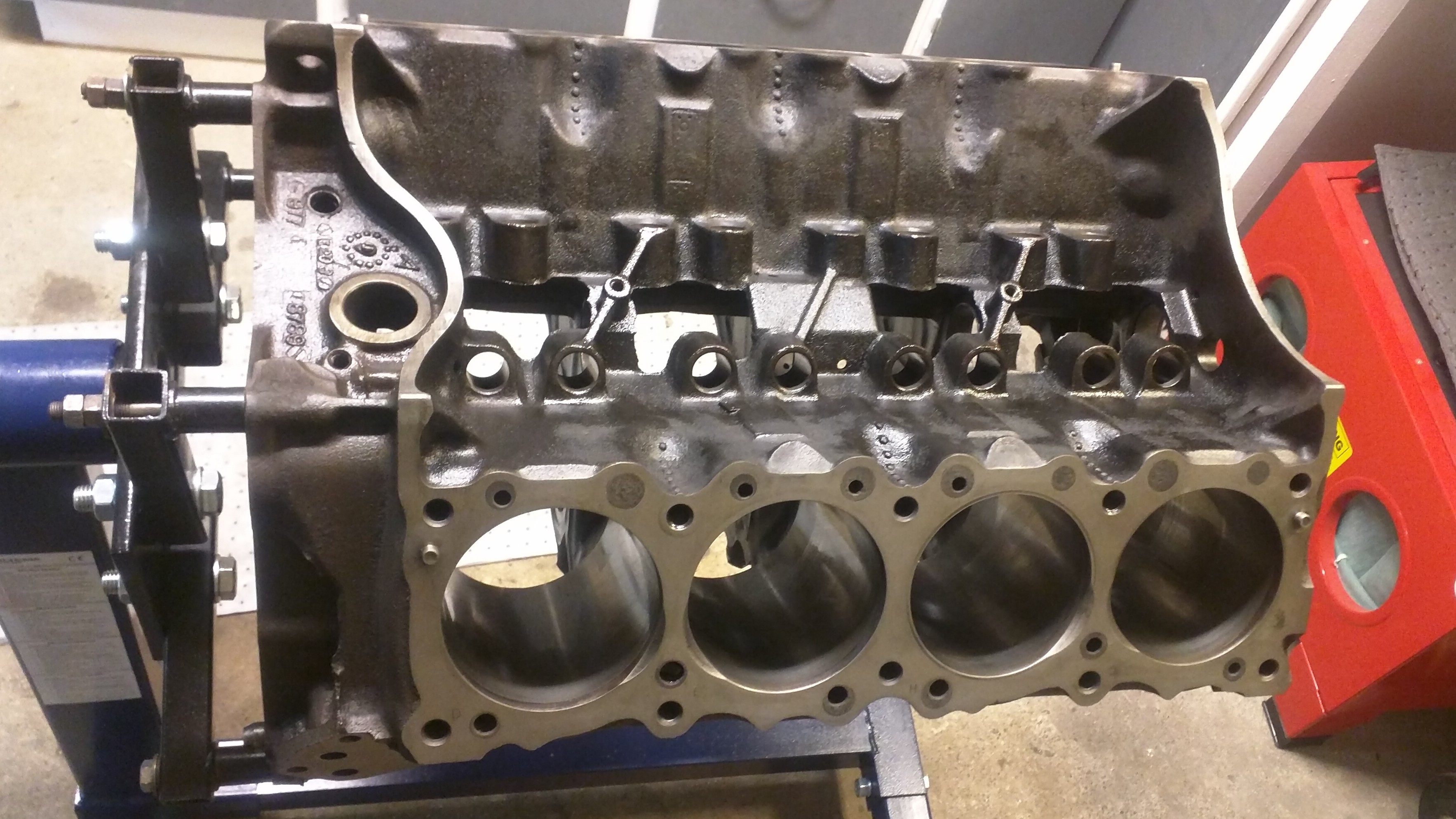 Hela motorn är iaf. nerriven och tvättad nu. Den ska borras, få ny vev och mina andra renoverade/portade #76-toppar. Beställde smidda TRW-kolvar till std 400, komplett rebuild kit och ett Melling SPC-7 kamkit med lyftare och fjädrar. Kommer nog bli en trevlig motor av den igen även om den består av delar från 350, 389, 400 och 428