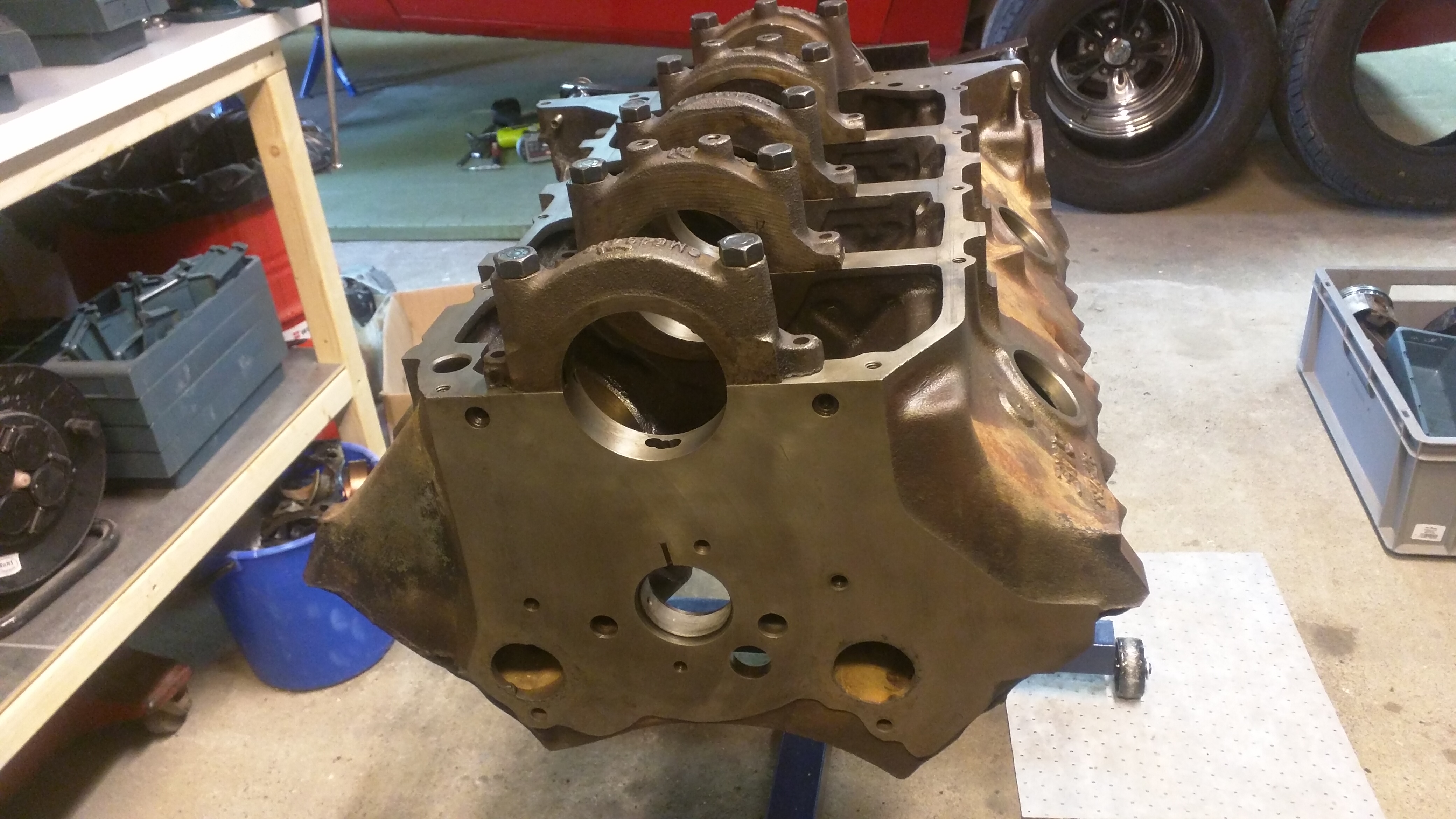 , kolv felvänd, 3 av 16 kolvringar var hela resten i flera bitar, kambult urgängad flera varv, alla lager var kopparfärgade, dampern helt separerad i vulkningen och kammen hade en nästan rund nock. Det mest fantastiska är att tidigare ägare körde en tripp på 30mil med motorn veckan innan jag köpte den! Anledningen att jag skrev Frankenstein i rubriken är det här: block 389 -66 WW (GTO 335HP Manuel), toppar #76 från -65, insug 4-port -69 9794234 + Q-jet 7029262, fördelare -69 1111959, vev 350 -73, oljetråg från 70-tal med baffle, transkåpa -69 men damper från -65